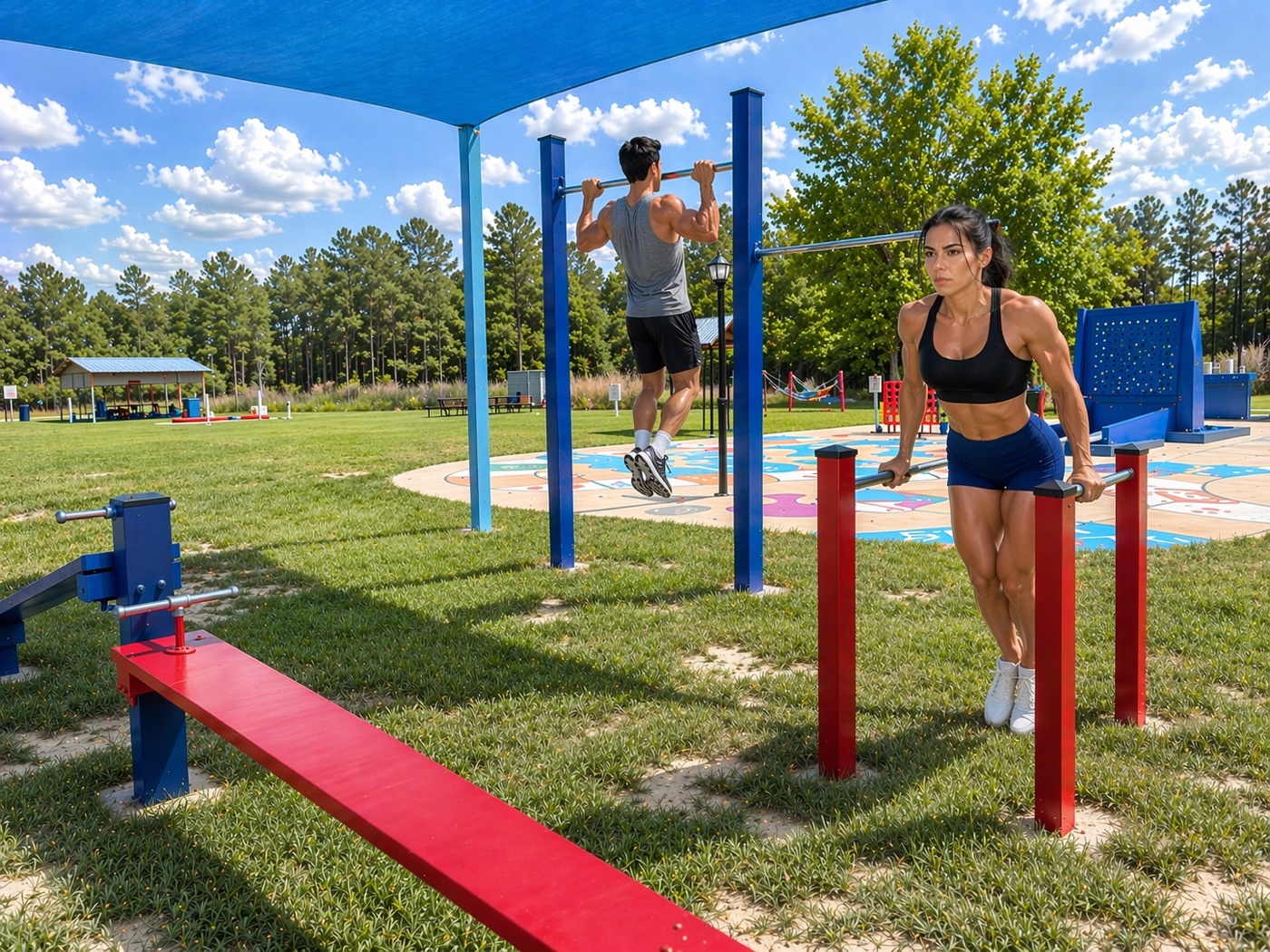 It has everything you need to get a great body weight workout! High and low pull up bars, dip bars, push up bars, sit up pads, and push up bars/balance beams.