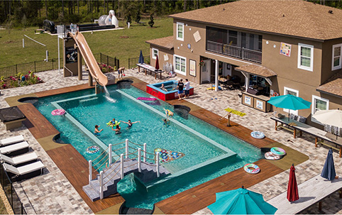 Our billiard-table swimming pool has a cue stick water cannon, lazy river, fast waterslide, AND a pool table! Read more..